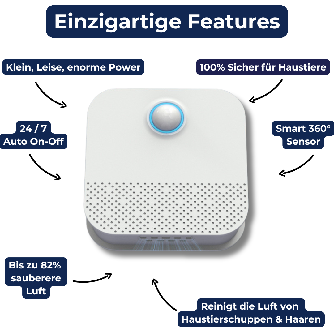 Beseitige hartnäckige Gerüche und sorge für ein frisches, allergiefreundliches Raumklima. Im Gegensatz zu einfachem Streu oder chemischen Lufterfrischern überdeckt PawAir Gerüche nicht nur, sondern neutralisiert sie sofort bei der Entstehung – und das völlig ohne Chemie. Dank der innovativen Ionentechnologie bleibt deine Luft dauerhaft frisch und sauber, ohne dass du regelmäßig Filter wechseln oder extra Reinigungsmittel kaufen musst.